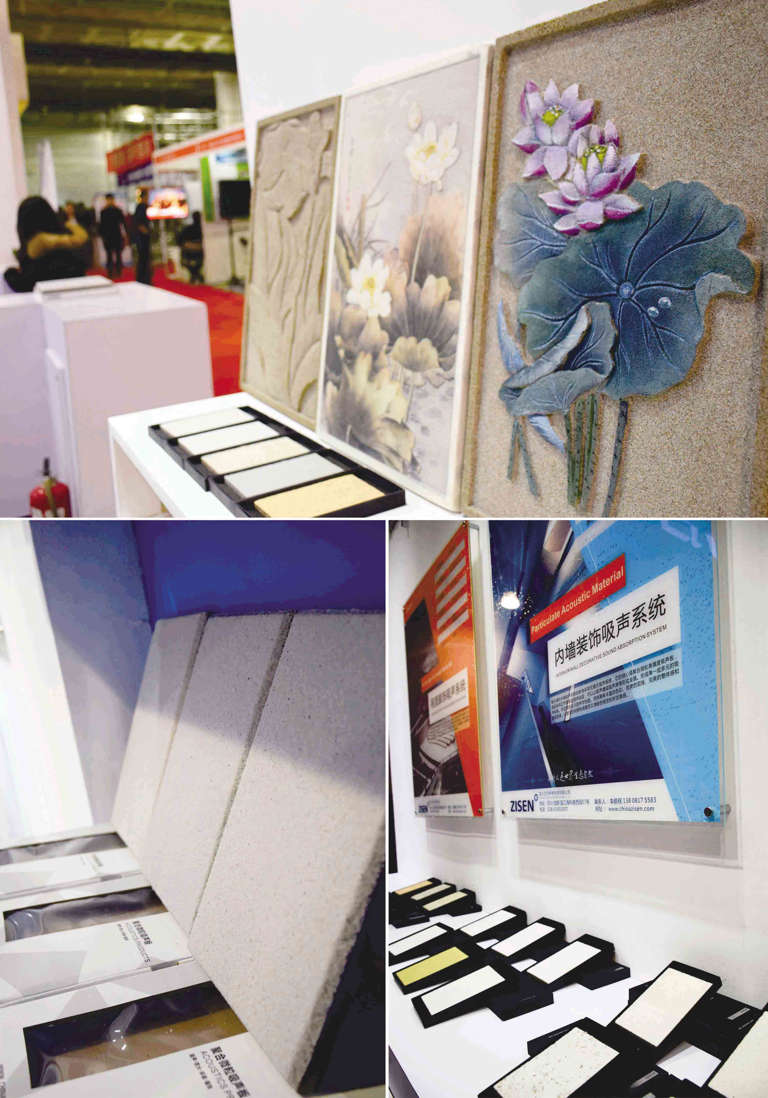在展會現場,我們主要介紹了聚合微粒材料的產品特點、產品性能及適用范圍等。通過幾個吸聲系統的說明來宣傳聚合微粒材料的隔音隔熱性能,用聚合微粒材料的基礎板材和裝飾面板來向來訪客戶直觀展示。