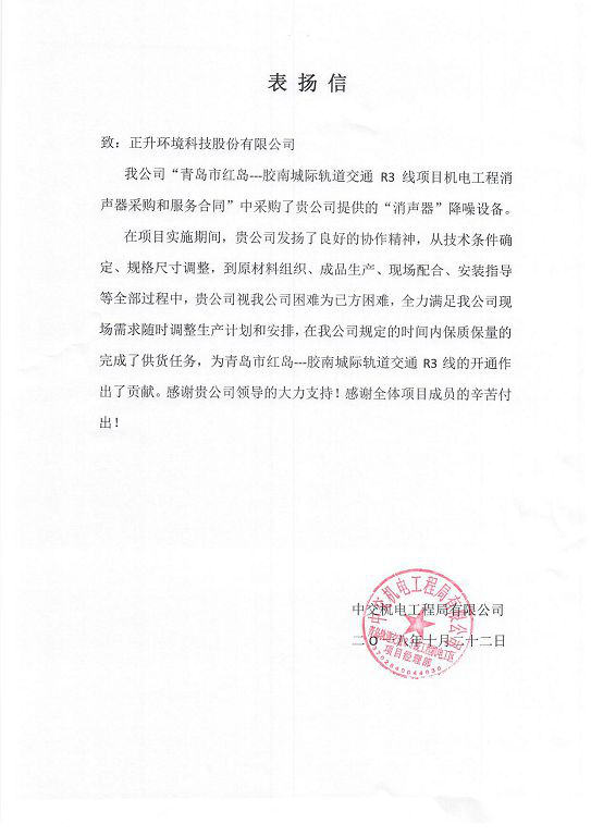 表揚信最后,中交機電工程局青島軌道交通R3線項目部特別感謝正升領導的大力支持!感謝全體項目成員的辛苦付出!