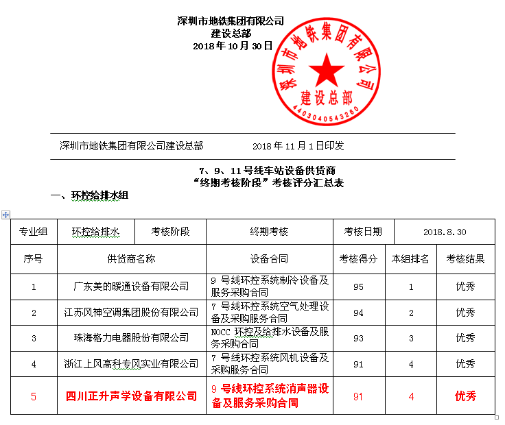 此次考核,是深圳市地鐵集團有限公司建設總部車站設備中心、合約法律中心、安全質量中心等部門在2018年第三季度,對深圳地鐵7、9、11號線車站設備供貨商進行的終期階段考核及綜合評價考核,正升公司作為環(huán)控給排水組的24個合同設備供貨商之一,參與此次進行了考核工作,最終正升以總分91分、小組總排名第四的突出表現(xiàn),獲得終期階段考核“優(yōu)秀”評價。
